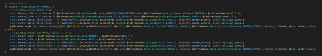To render a button, I needed to render all the rectangle, and since I was inspired by the raylib design, I tried to use enum for calculate the index for styling; however, I did a pretty bad mistake due to the lack of idea of how strict the type in zig. Because I normally think that indexing in array is always in positive, I have use unsigned integer for the enum, meanwhile the coordination are float based, and the function call are integer. As a result, I ended with the following “Master Piece”!