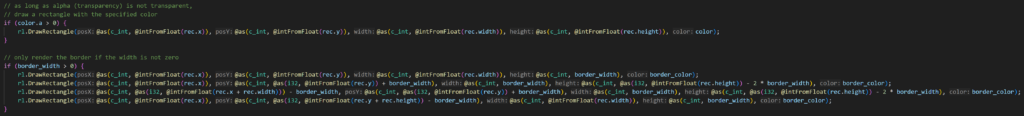 However, how to properly plot 5 rectangles in a way that the borders are in the correct location? After I have reverse engineering the library for printing the rectangle, I find it both complicated yet fascinating as someone who is a beginner in learning lower level of gui libraries. To draw rectangles surrounding to the middle rectangle, we need to know the offset after an edge is applied and the thickness of the border. Since the size of the rectangle and border are dynamic, we can’t calculate with a hard coded constant because the shape and the ratio will be distorted if the resolution is changed, and the border won’t be customizable in terms of their style.